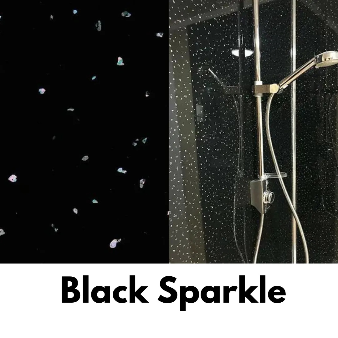 2 Wall Shower Kit Contents: 2 x 1m Wide Panels, 1 x Internal Corner, 2 x end caps (Chrome / White / Black) & 2 x Gripbond Pro